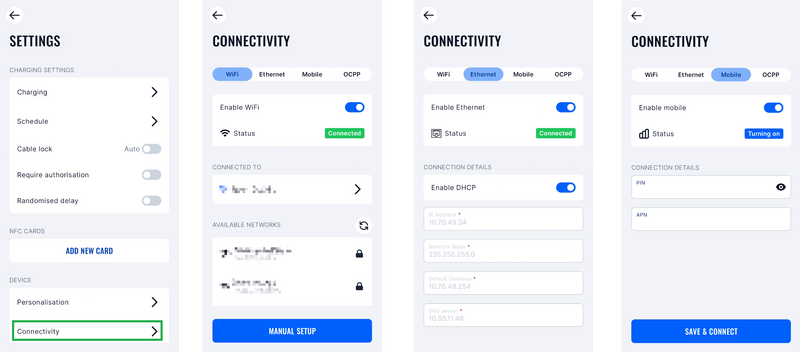 1. Konfiguráld be a töltőállomást a telefonos applikáción keresztül, hogy csatlakozni tudjon az OCPP 1.6 JSON szerveredhez. Ehhez ismerned kell a szerver IP-címét vagy domain nevét, valamint az OCPP 1.6 JSON protokollhoz tartozó port számát
