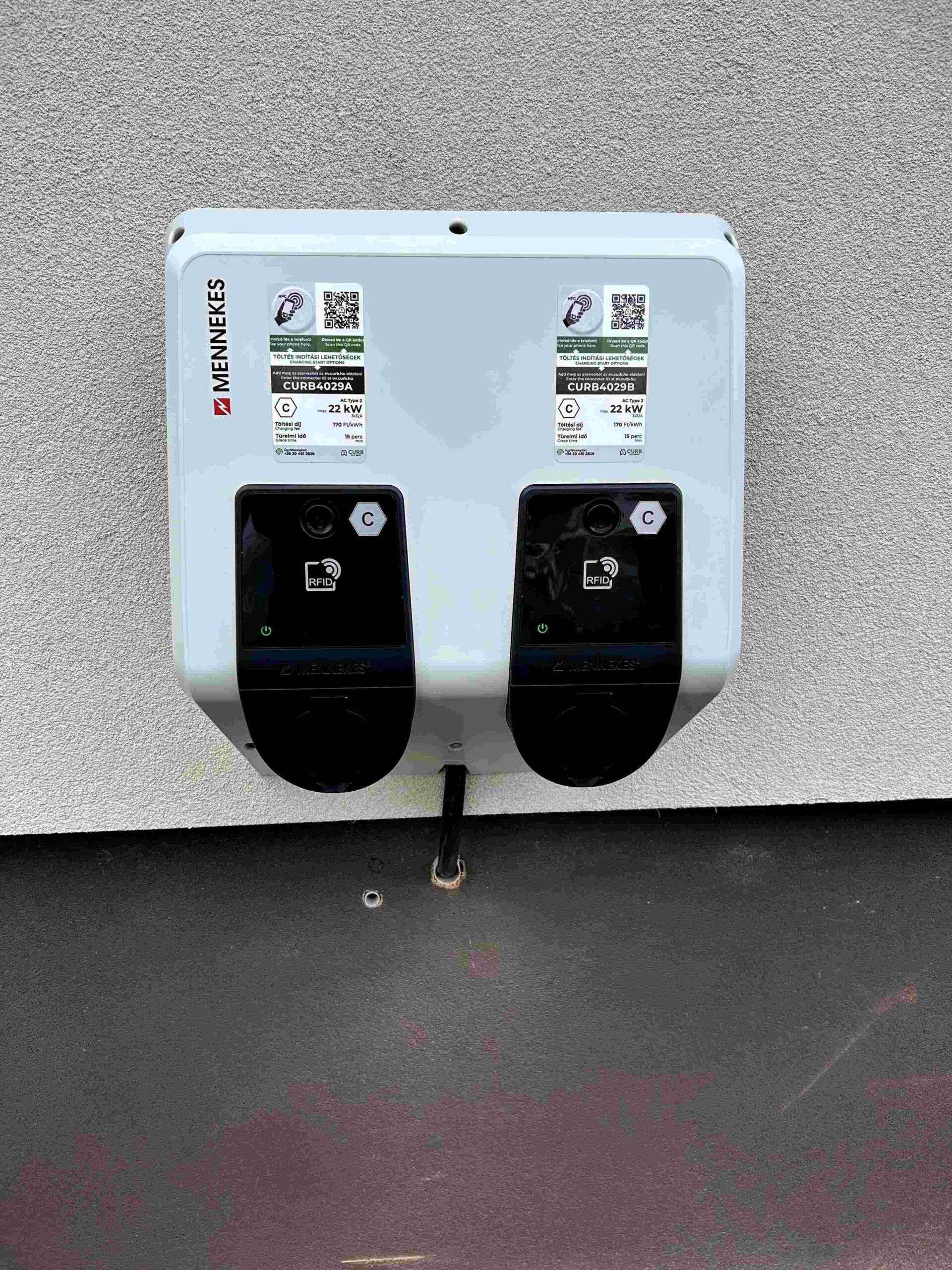 Debrecenben, a DH-Szerviz Kft parkolójában lévő elektromos autótöltő berendezés két töltőcsatlakozóval rendelkezik, így egy időben két autó töltésére van lehetőség.