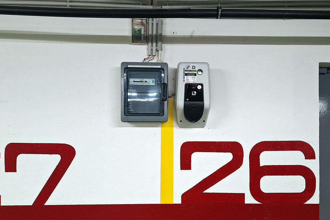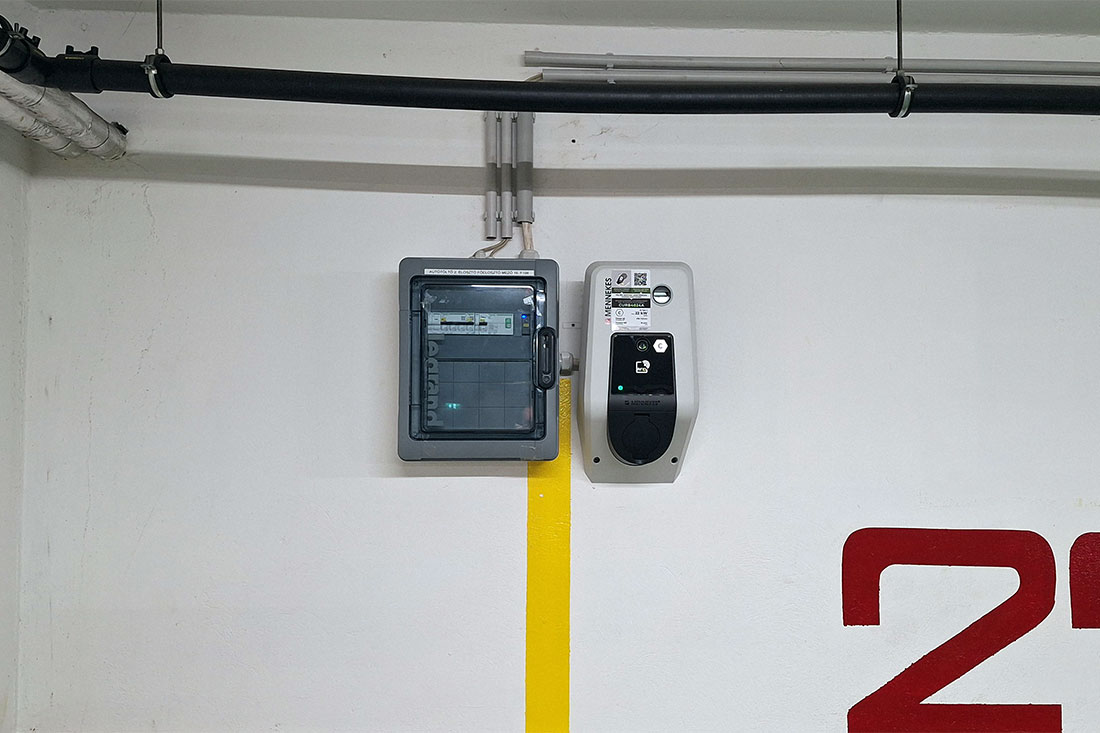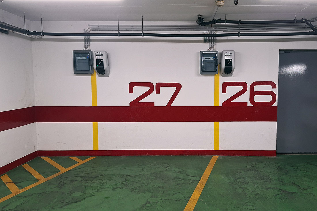 Budapesten, a Hotel InterContinental mélygarázsának első szintjén lévő két elektromos autótöltő berendezés mindegyike egy-egy töltőcsatlakozóval rendelkezik.